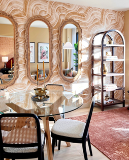 Each residence drew from a different psychographic profile developed by the sales and marketing team, translating lifestyle narratives into spatial form. A restaurateur’s socialite apartment celebrates bold color and texture in ochre and sienna tones; a finance bachelor’s studio features moody foliage-print wallcoverings and sleek modern furnishings; an art student’s retreat blends creativity and restraint through layered neutrals and tactile finishes; and a young couple’s home balances organic curves with calm, family-ready warmth. Across all six units, light, natural materials, and soft organic lines unify the collection while allowing each to express its own distinct character.